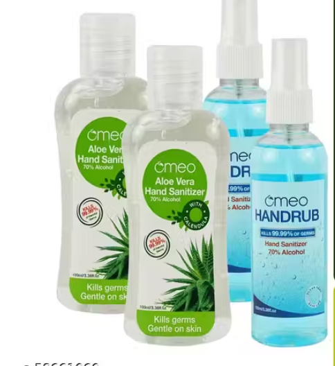 Product Name : Omeo Aloe Vera Hand Sanitizer Gel and Omeo Hand Rub Sanitizer Spray 100ml | With 70% Alcohol Kills 99.9 Germs Combo ( Pack of 4) )